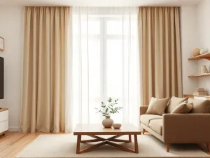 Beż + ecru: wybierz gładką, beżową roletę rzymską i lekkie zasłony w odcieniu ecru z subtelną fakturą lnu, by uzyskać ciepły, klasyczny efekt pełen spójności i optycznego powiększenia przestrzeni.